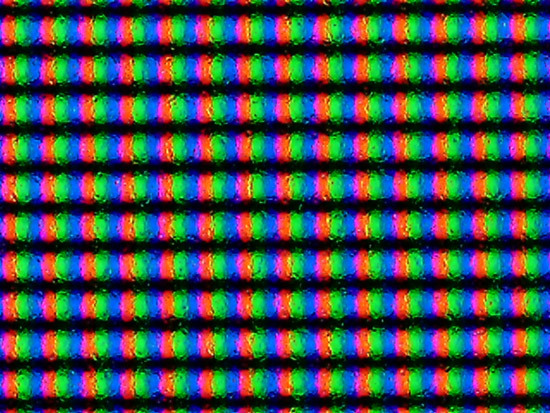 Mikroskopischer Blick auf die Subpixel, mit Fokus auf die Bildschirmoberfläche: Der BenQ besitzt eine leicht stumpf-matte Oberfläche mit mikroskopisch sichtbaren Vertiefungen zur Diffusion.