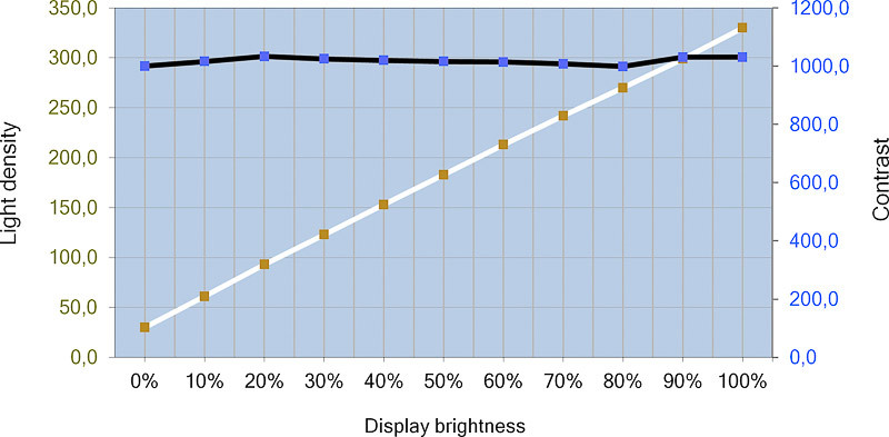 Die Maximalhelligkeit bleibt auch nach der Kalibrierung unverändert. Die Minimalhelligkeit steigt geringfügig auf 30 cd/m². Der zur Verfügung stehende Bereich gibt somit viel Spielraum zur Anpassung an unterschiedliche Arbeitsbedingungen und ermöglicht auch ein Arbeiten im Dunkelraum.