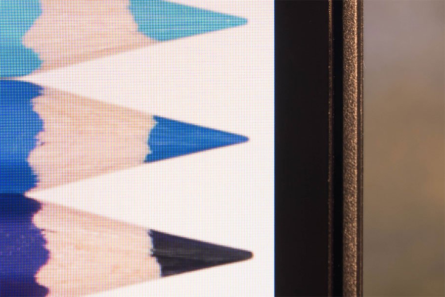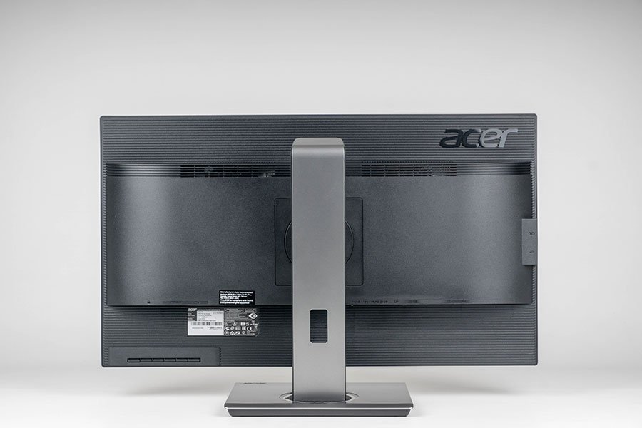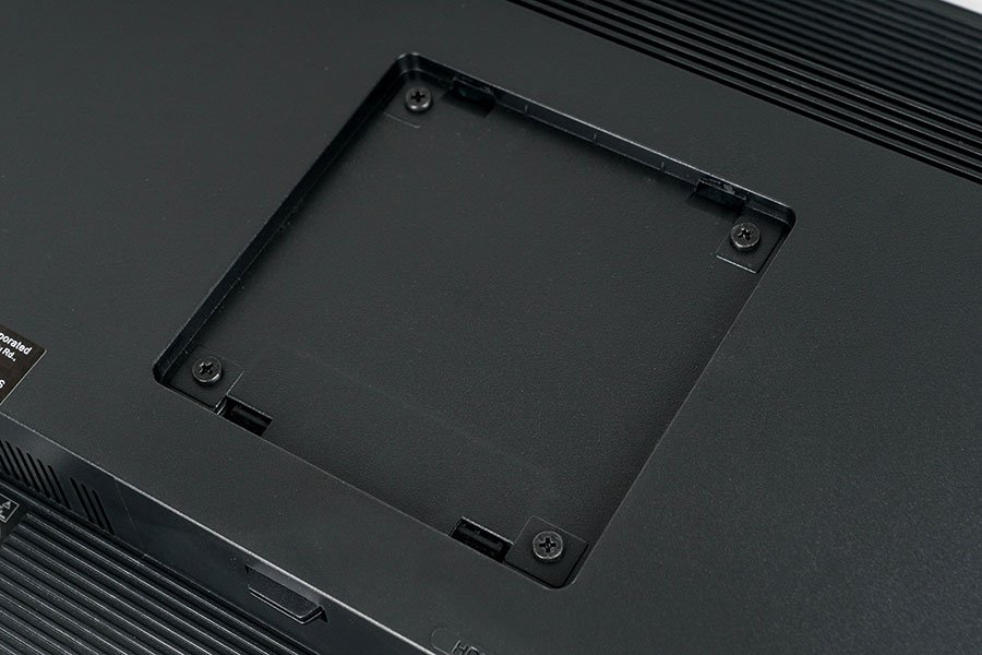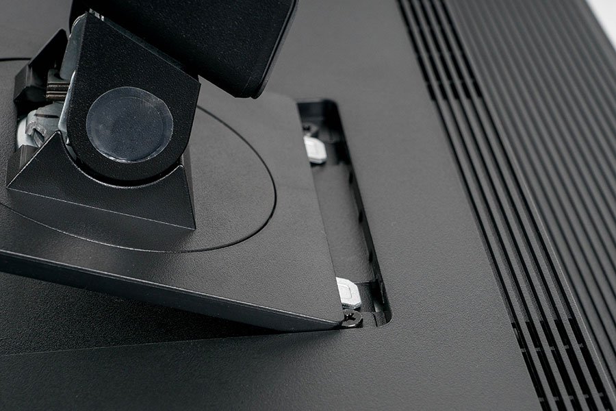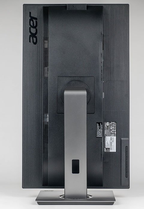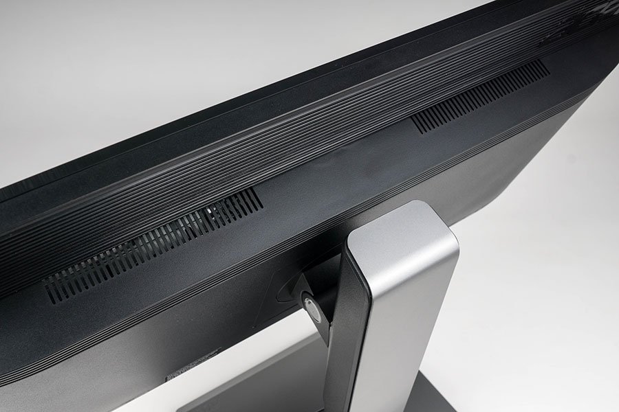 Die Rückwand wird horizontal durch ein Gehäuse geteilt, hinter dem sich die Elektronik des Displays befindet. An der Oberseite befinden sich zwei Belüftungsöffnungen, die den Monitor aufgrund des integrierten Netzteils mit frischer Luft versorgt.