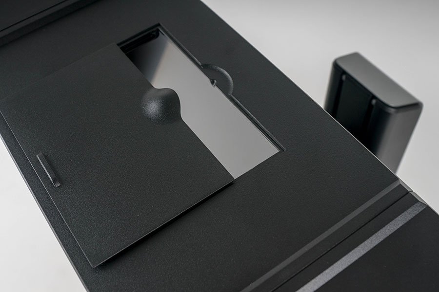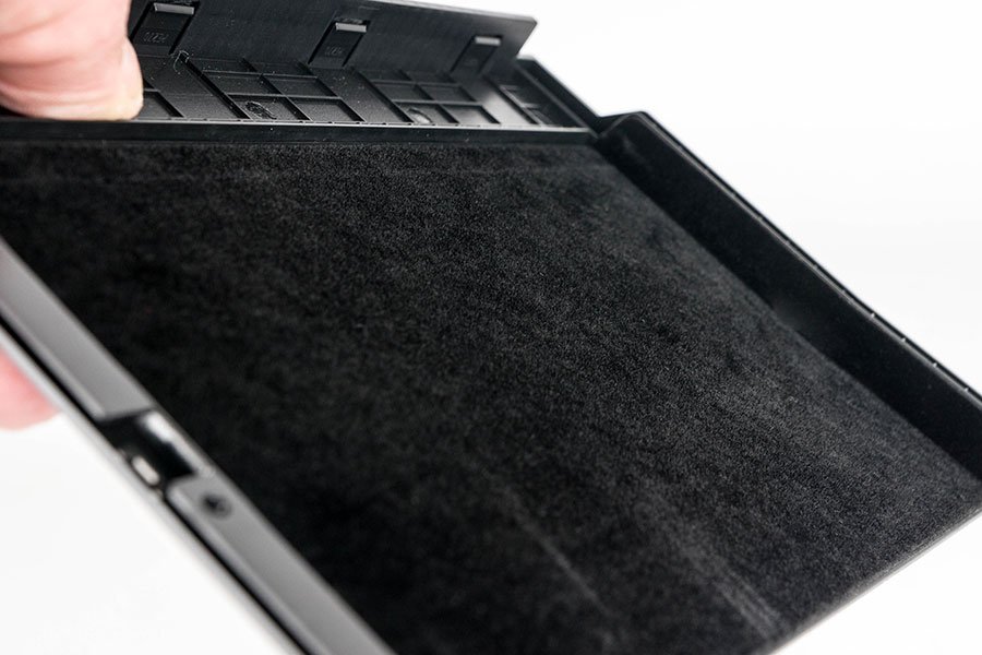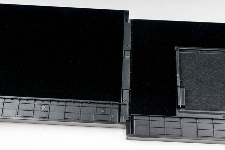Der hintere Bereich des Oberteils verfügt über einen Winkel, der hinter den Monitorrahmen gelegt wird, während sich an den Außenseiten eine Nut befindet, in die die Seitenteile einfassen und so das „Dach“ der Haube Halt findet. Die Innenseite der Abschattungshaube ist mit Samt ausgekleidet und verfügt oben in der Mitte über ein verschließbares Fenster, durch das eine Messsonde gelassen werden kann, um das Display auch bei aufgesetzter Haube kalibrieren zu können.