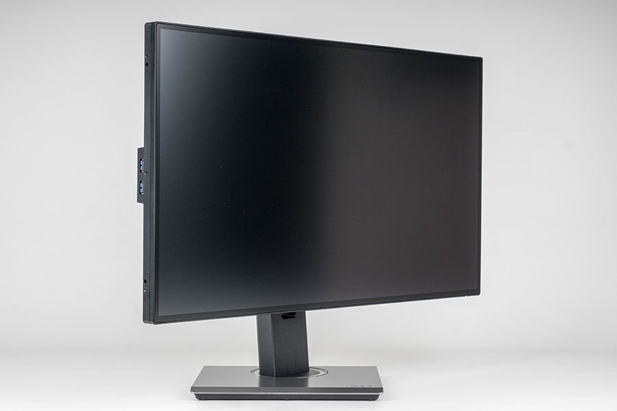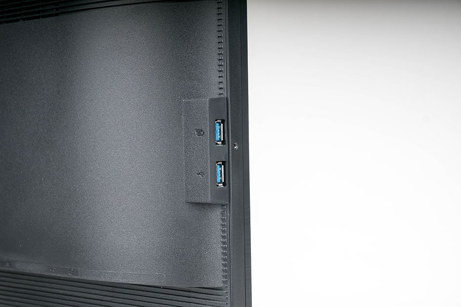 Aufgrund des schmalen Rahmens befinden sich in der Front natürlich auch keine Schriftzüge. Einzig die Betriebs-LED schaut an der rechten unteren Ecke heraus. Während des Betriebs leuchtet sie blau und im Standby gelb. Die LED lässt sich über das OSD-Menü unter „System -> LED-Steuerung“ in zehn Stufen dimmen, bis das Licht erlischt. Die Tiefe des Displays beträgt an allen Seiten 20 mm. Hinter der linken Seite befinden sich zwei USB-3.0-Anschlüsse, wovon einer über eine Schnelladefunktion verfügt.