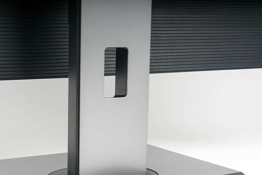 Der Tragarm wirkt sehr robust und verfügt an der Rückseite über eine hellgraue Oberfläche. Im unteren Drittel ist das Fenster für das Kabelmanagement zu finden.