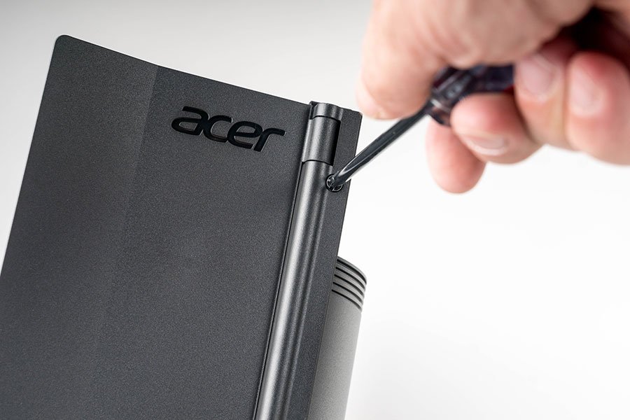 Die Montage des Acer PE270K ist bis auf die Abschattungshaube werkzeugfrei zu erledigen. Dafür muss zunächst der Tragarm mit dem Fuß verbunden werden, was über die zwei Schrauben unterhalb des Fußes geschieht. Anschließend muss noch das Display an den Tragarm angebracht werden.