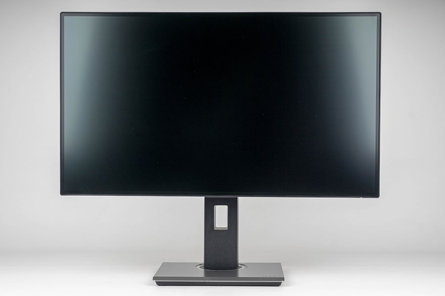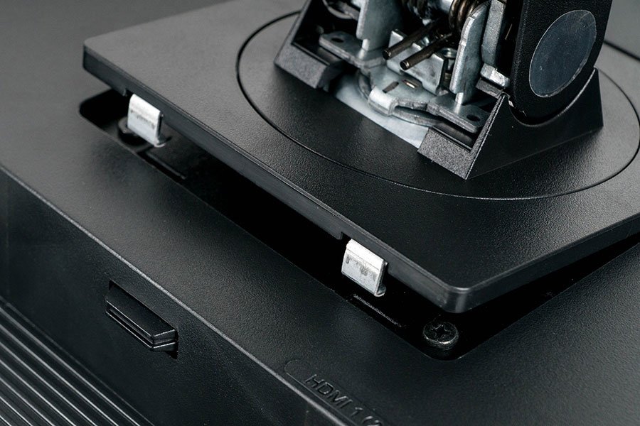 Hierfür befindet sich mittig in die Rückwand eingelassen die VESA-100-Vorrichtung, die auch gleichzeitig für alternative Haltevorrichtungen bereitsteht. An der Ober- und Unterseite befinden sich zwei Aussparungen, in die die zwei oberen Nasen der Trägerplatte des Tragarms eingehängt werden. Über einen Mechanismus schnappen schließlich die zwei unteren hakenähnlichen Nasen der Trägerplatte ein und verbinden das Display mit dem Monitorarm. Durch einen Entriegelungsknopf unterhalb des Gehäuses lässt sich das Display in umgekehrter Reihenfolge auch wieder vom Monitorarm lösen.