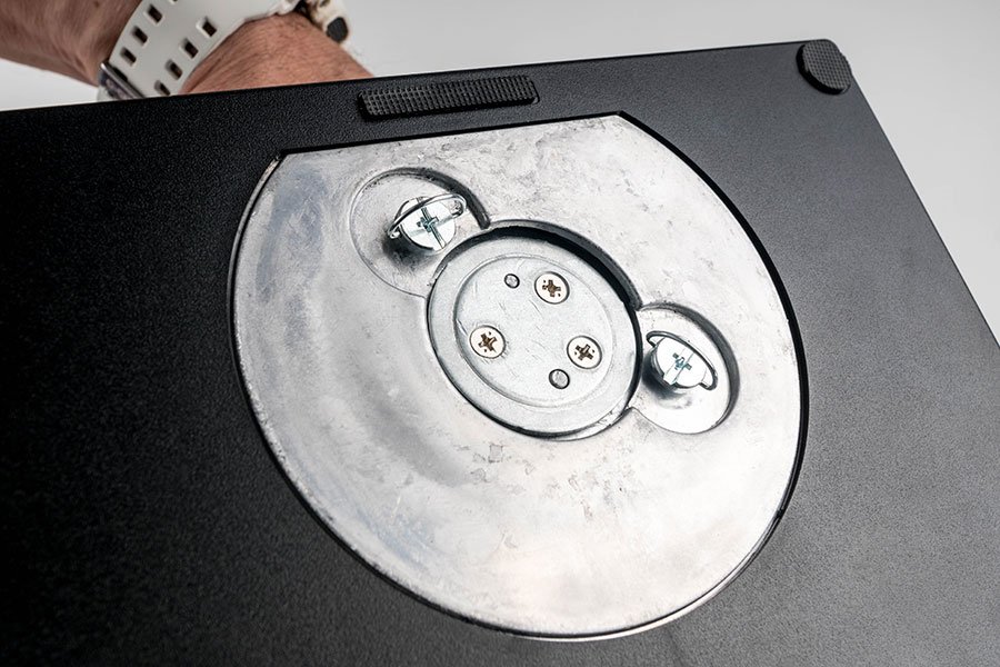Die Bodenplatte mit den Maßen von 210 x 245 mm zeigt eine anthrazitfarbene Oberfläche, verfügt aufgrund des Metallkerns über ein ordentliches Gewicht und verhilft dem Acer PE270K zu einem festen Stand.