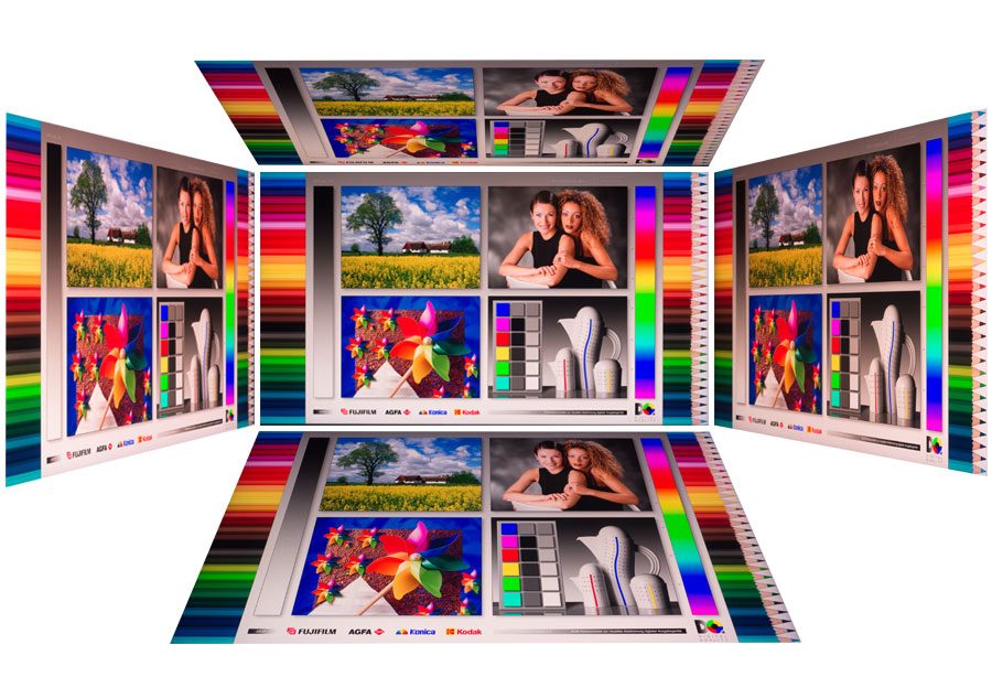 Wir untersuchen die Bildhomogenität anhand von vier Testbildern (Weiß, Neutraltöne mit 75 %, 50 %, 25 % Helligkeit), die wir an 15 Punkten vermessen. Daraus resultieren die gemittelte Helligkeitsabweichung in % und das ebenfalls gemittelte Delta C (d. h. die Buntheitsdifferenz) in Bezug auf den jeweils zentral gemessenen Wert.