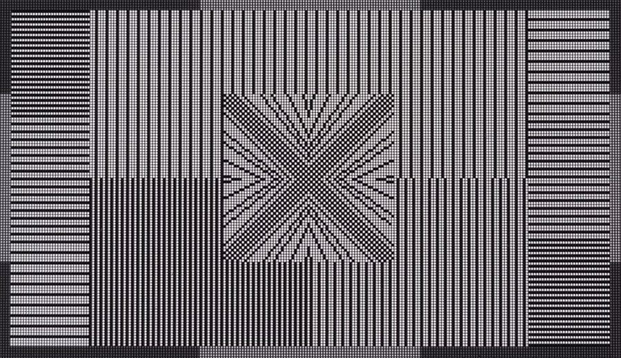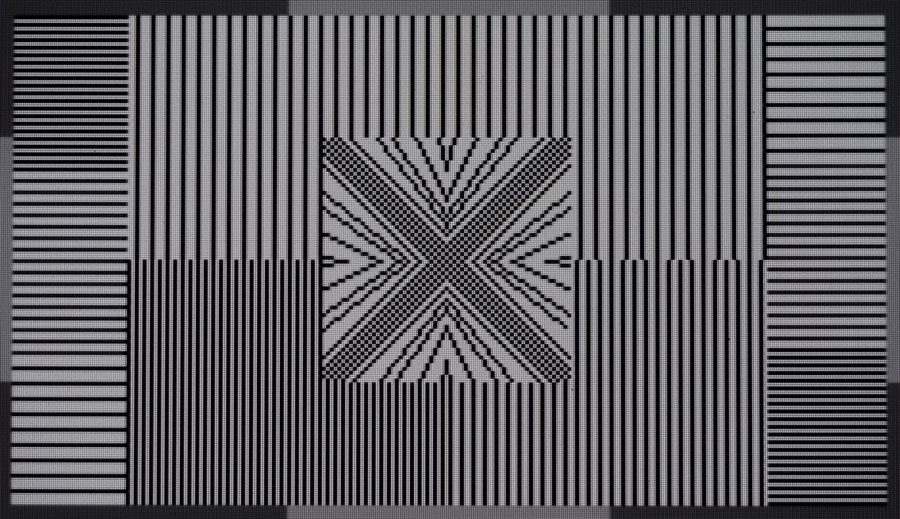 Wir testen die Qualität der Interpolation anhand einer Testgrafik. Bei der nativen Auflösung wird die Grafik erwartungsgemäß scharf und detailreich angezeigt. Setzt man die Auflösung auf „HD ready“ mit 1280 x 720 Bildpunkten herunter, wird der hinzugewonnene Platz mit grauen Pixeln aufgefüllt. Das meistert der Acer Predator X32FP sehr ordentlich, da selbst bei verringerter Auflösung noch das feine Muster im Inneren des Kreuzes erkennbar ist.