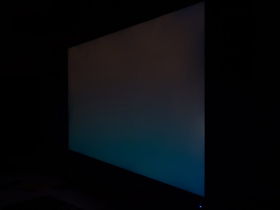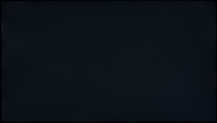 Bei ausgeschaltetem „Adaptive Dimming“ zeigt sich die Schwarzbilddarstellung eher in einem dunklen Blauton. An den Rändern sind einige Hotspots zu erkennen, die aber sehr mild daherkommen und nur bei absoluter Dunkelheit zu sehen sind. Bereits bei gedimmtem Licht spielen sie hier keine Rolle mehr. Selbst bei fünffach verlängerter Belichtungszeit ist nahezu keine Wolkenbildung zu erkennen.