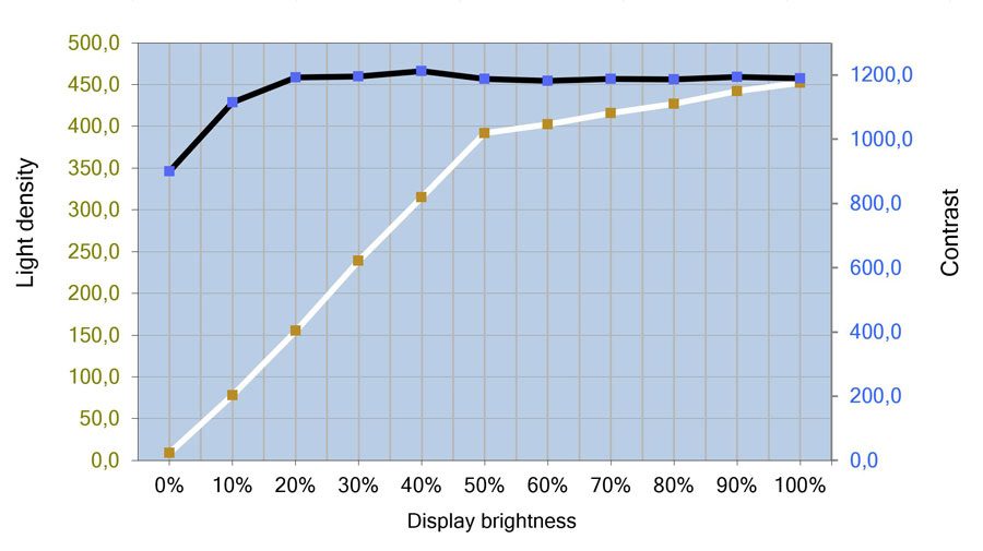 Mit einem durchschnittlichen Kontrastverhältnis von 1158:1 wird ein sehr gutes Ergebnis erreicht. Nach der Kalibrierung legt der Wert mit 1180:1 sogar noch etwas zu. In der Spitze wird ein Kontrastverhältnis von 1211:1 erzielt.