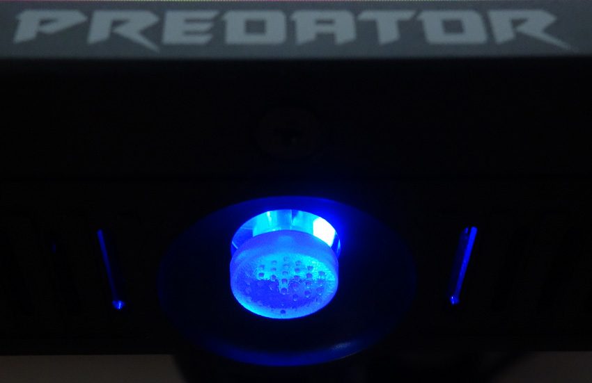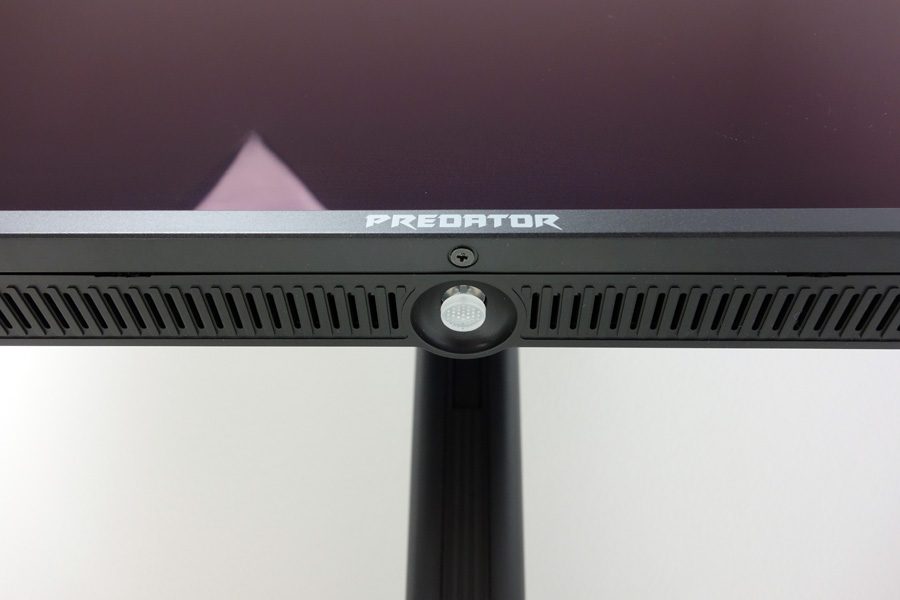 Der Joystick ist gleichzeitig die Betriebsanzeige. Ist der Monitor in Betrieb, leuchtet sie durchgängig blau. Wechselt das Gerät in den Ruhezustand, blinkt die Betriebsanzeige ungefähr im Sekundentakt. Führt der Acer X27UX1 eine Pixelreinigung durch, blinkt die Betriebsanzeige schnell. In jedem Betriebszustand bleibt die Farbe gleich, obendrein lässt sich die Beleuchtung nur abschalten, wenn der Proband ausgeschaltet wird. Das ist grundsätzlich allerdings kein Problem, da der Joystick von vorn nicht zu sehen ist und die Beleuchtung deshalb im Betrieb nicht stört.