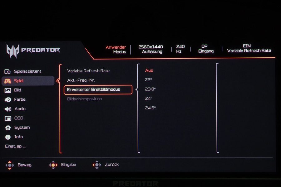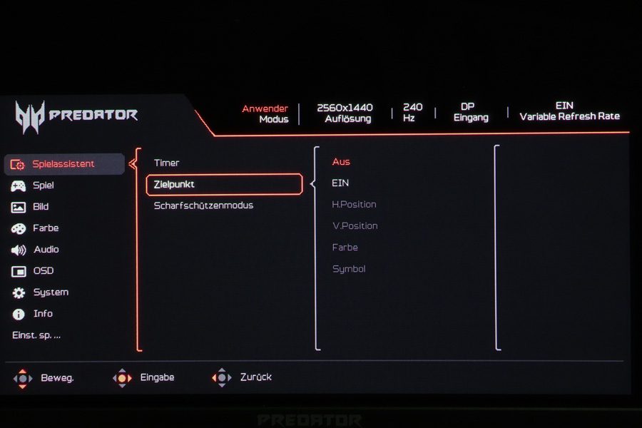 Herkömmliche Bedientasten sind nur noch selten anzutreffen. Die meisten Hersteller bieten nur noch eine Taste für die Bedienung an, so auch der Acer X27UX1. Mit einem 5-Wege-Joystick, der mittig an der Gehäuseunterseite positioniert ist, wird das OSD gesteuert. Die Steuerung ist intuitiv und komfortabel, und durch die sinnvolle Platzierung ist der Joystick gut erreichbar, selbst wenn mehrere Monitore nebeneinanderstehen.