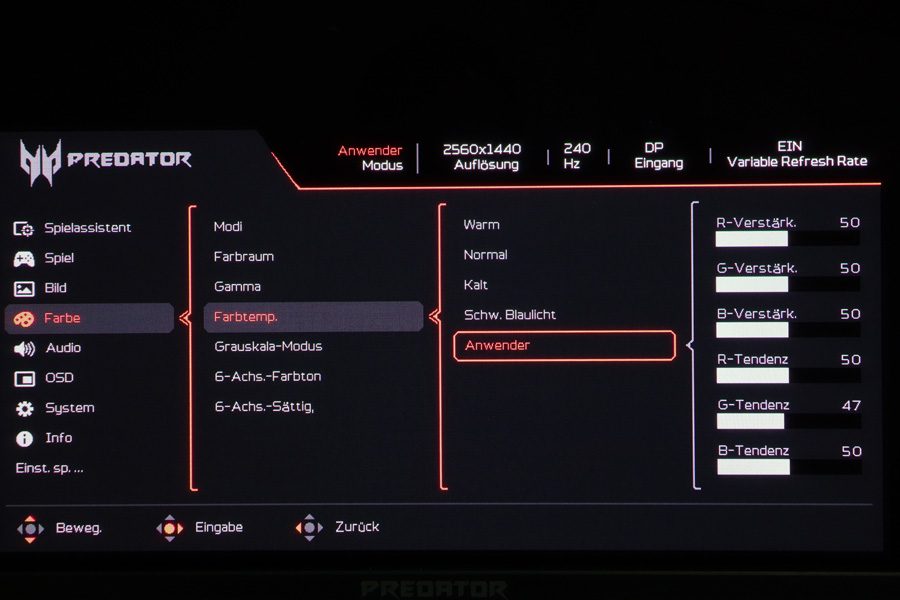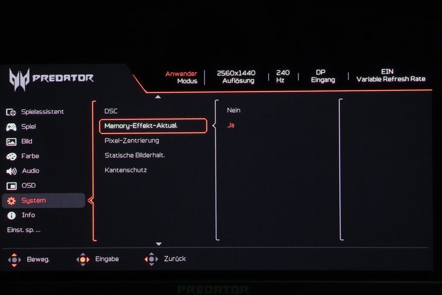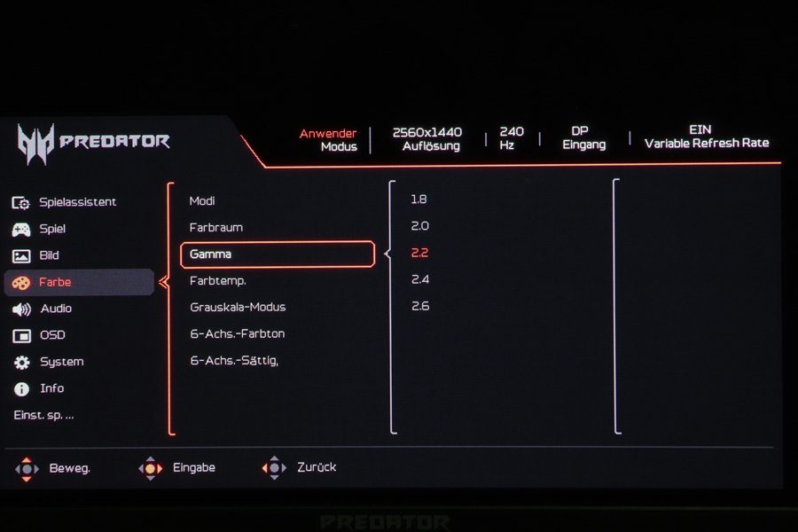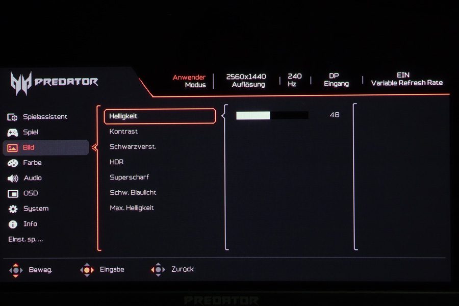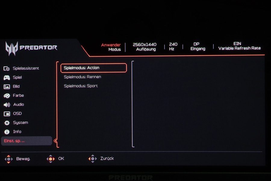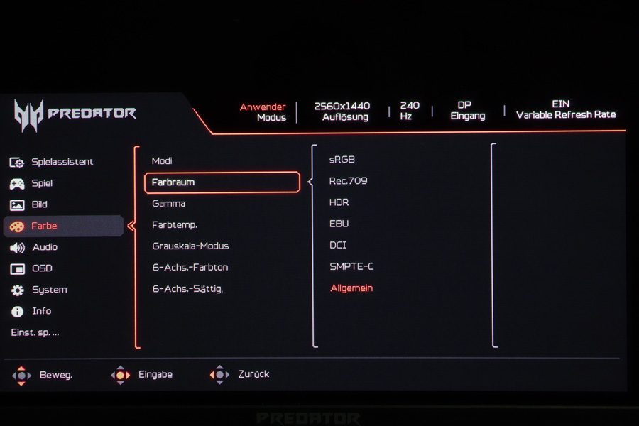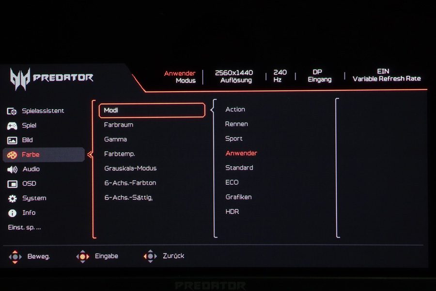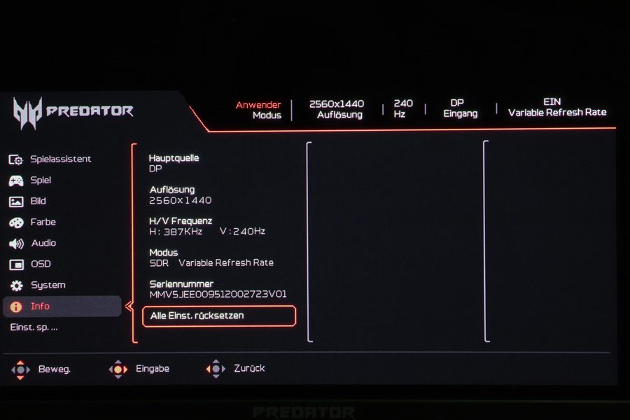 Über den Eintrag „Menü“ im OSD-Startmenü gelangt man in das OSD des Acer X27UX1, das umfangreiche Einstellungen bietet. Es ist in neun Kategorien gegliedert, und am oberen Rand des OSDs werden der ausgewählte Bildmodus, die Auflösung, die Bildwiederholfrequenz, der Signaleingang und die „Variable Refresh Rate“ als permanente Informationen angezeigt. Das OSD-Menü zeigt sich modern – mit Piktogrammen vor den Kategorien und roter Akzentfarbe.