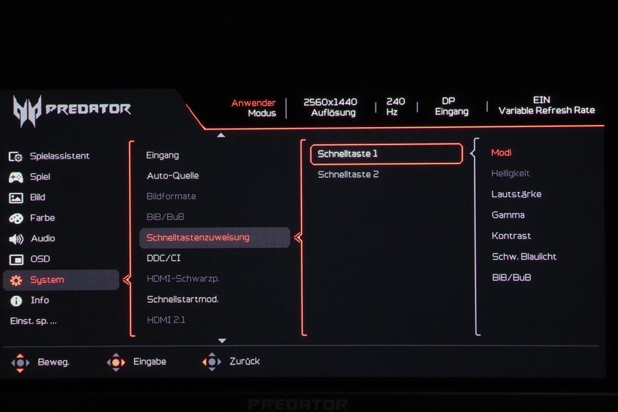 Wenn der Joystick in welcher Form auch immer betätigt wird, erscheint zunächst ein OSD-Startmenü. Es stehen vier Optionen zur Auswahl, wobei nur Eingang und Menü fix sind. Die oberen zwei Optionen können individuell belegt werden. Werkseitig sind Bildmodus und Helligkeit eingestellt.