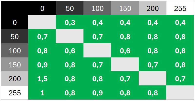 Wie nicht anders zu erwarten, sind die Reaktionszeiten beim eingesetzten OLED-Panel extrem schnell. Obwohl wir die 0,03 ms mit unserem Mess-Equipment nicht erreichen, gibt es an der Schnelligkeit nichts auszusetzen. Wir messen den Schwarz-Weiß-Wechsel (0–255) mit 0,4 ms und den schnellsten Grauwechsel mit 0,3 ms. Der Mittelwert über alle Messpunkte liegt bei 0,7 ms.
