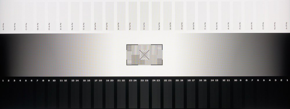 Der Grauverlauf ist in der Werkseinstellung nahezu einwandfrei, Farbschimmer treten nicht auf. Die hellsten Stufen sind nahezu vollständig zu erkennen, die dunkelsten Stufen bis einschließlich 6. Alle Graustufen wirken völlig neutral, allerdings ist die Abstimmung sehr kühl.