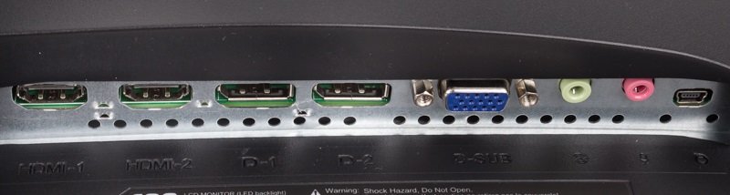 Bei den beiden abgebildeten HDMI-Anschlüssen handelt es sich einmal um den Standard 1.4 und einmal um 2.0. Die DisplayPort-Anschlüsse besitzen beide den 1.4-Standard. Die vier Audio-Anschlüsse sind unterteilt in zwei Ein- und zwei Ausgänge jeweils für Mikrofon und Lautsprecher oder Kopfhörer.