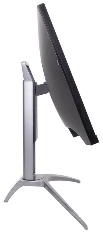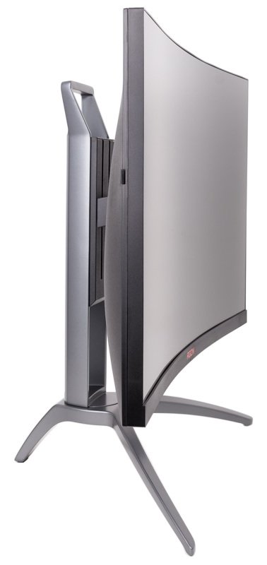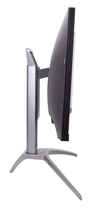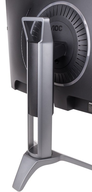Der Standfuß wird mit einer Schraube am Standbein befestigt. Diese besitzt eine Lasche zum Festschrauben, wodurch kein Werkzeug benötigt wird. Diese Kombination wird über ein Schnellsystem am Monitor eingerastet. Der Standfuß sieht optisch feingliedrig aus, wurde aber aus Stahl gefertigt und hält den Bildschirm daher sehr stabil an seinem Platz. Das Standbein besitzt im unteren Teil ein Loch, um Kabel nach hinten wegzuführen, sowie für den Transport einen Tragegriff im oberen Teil.