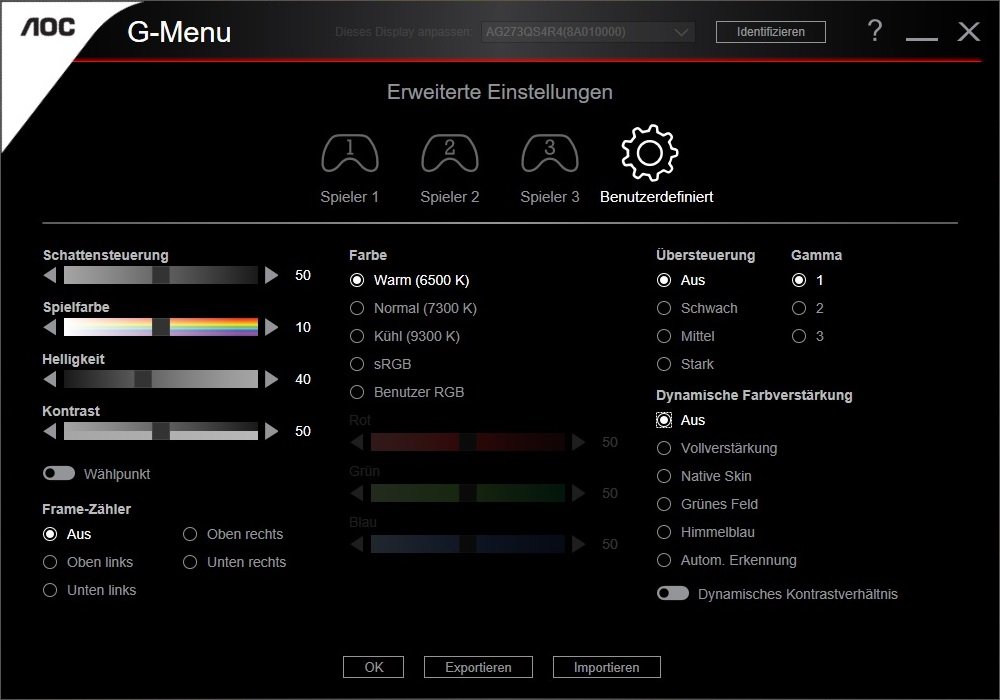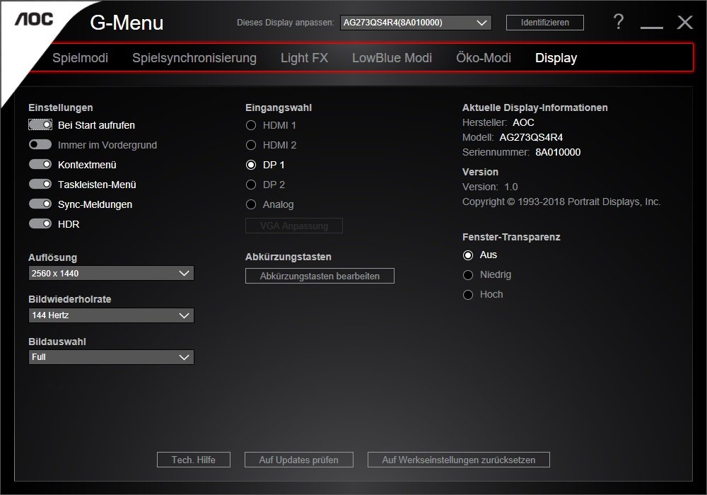 Eine dritte Möglichkeit ist die Steuerung über die auf der CD mitgelieferten Software G-Menu. Es sind nicht alle Einstelloptionen vorhanden und manche Bereiche ausgegraut, obwohl sie über das normale OSD veränderbar sind. Für die gängigen Einstellungen ist die Software aber praktisch, da sie bequem mit der Maus bedient werden kann.