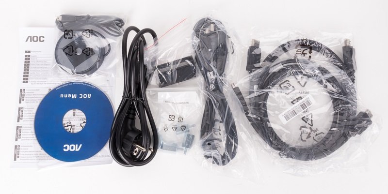 Im Lieferumfang befinden sich jeweils ein Strom-, HDMI-, DisplayPort- und USB-Kabel. Außerdem gibt es Garantiebestimmungen, ein Schnelltastenbedienfeld, Verlängerungsschrauben für die VESA-Bohrungen sowie eine Kabelklemme. Auf der mitgelieferten CD befinden sich das Handbuch in verschiedenen Sprachen sowie einige kleine Software-Tools für den Monitorbetrieb, die wir teilweise in späteren Abschnitten genauer vorstellen.