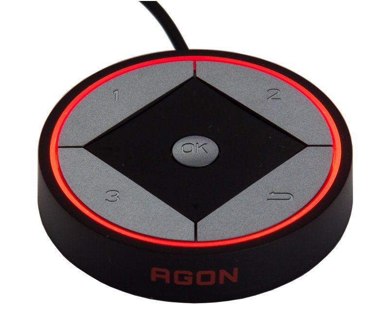 Eine Alternative besteht mit der externen Steuerungs-Einheit, die per Kabel direkt am AOC AG273QCX befestigt und außen dauerhaft rot beleuchtet wird. Wird auf den mittleren Button gedrückt, öffnet sich das Menü und es kann nach demselben Prinzip navigiert werden. Das schwarze Quadrat in der Mitte besitzt in jeder Ecke einen Druckpunkt für diese Navigation. Zusätzlich stehen vier weitere Tasten zur Verfügung. Eine springt im Menü einen Schritt zurück und die anderen drei rufen jeweils einen individuell einstellbaren Spielmodus auf. Diese Modi lassen sich natürlich auch zweckentfremden, sodass zum Beispiel ein Spiel-, ein Arbeits- und ein Filmprofil hinterlegt werden können.