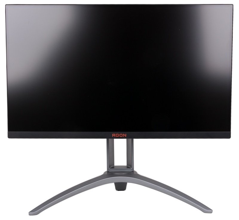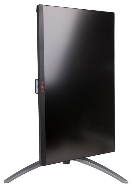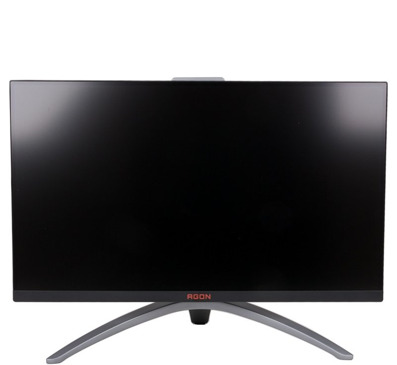 Der Monitor ist an drei Seiten fast rahmenlos. Ein Areal von etwa einem halben Zentimeter wird am Randbereich im Betrieb allerdings nicht für die Bilddarstellung genutzt. Das Gerät besitzt daher ein sehr schlichtes Erscheinungsbild. Auffällig ist nur der rote Schriftzug „AGON“ mittig auf dem Frontrahmen. Dies ist die Bezeichnung der Gaming-Serie von AOC. Auf der Rückseite ist ebenfalls ein AGON-Logo zu sehen. Zusätzlich ist ein transparenter mittiger Ring erkennbar. Hinter diesem befinden sich LEDs, die in vielen verschiedenen Farben leuchten können, was wir in einem späteren Abschnitt genauer vorstellen.