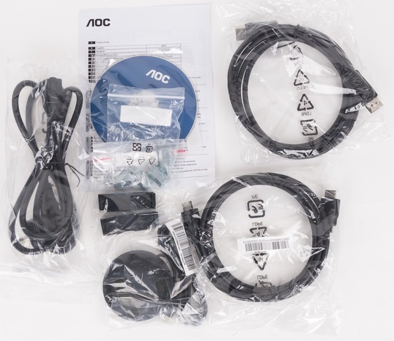 Im Lieferumfang befinden sich eine kabelgebundene Fernbedienung, vier Abstandhalter für das Anbringen einer externen Halterung, Kabelklemmen, ein Stromkabel sowie die Anschlusskabel für HDMI und DisplayPort. Auf der beigelegten CD sind eine Anleitung in deutscher Sprache sowie drei kleine Programme zur Steuerung bzw. zur Erleichterung des Monitorbetriebs enthalten.