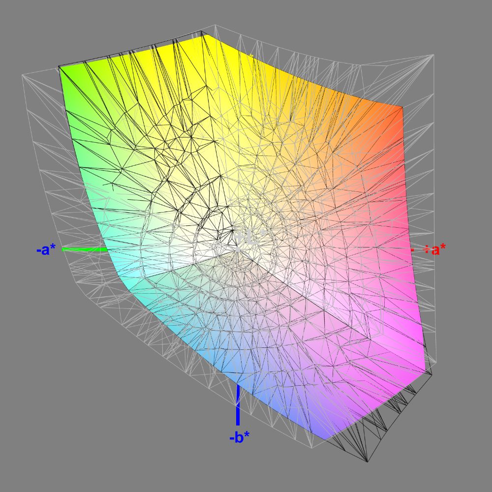 Im sRGB-Modus wird der sRGB-Farbraum zu 86 % abgedeckt – nach der Kalibrierung zu 95 %. Den etwas erweiterten Farbraum sollte der sRGB-Modus idealerweise entsprechend einschränken. Wie aus den nachfolgenden Grafiken hervorgeht, wurde der Farbraum zwar eingeschränkt, aber leider zu viel. Ein fehlender Farbumfang wird durch ein schwarzes Gitter gekennzeichnet, eine größere Abdeckung durch ein hellgraues.