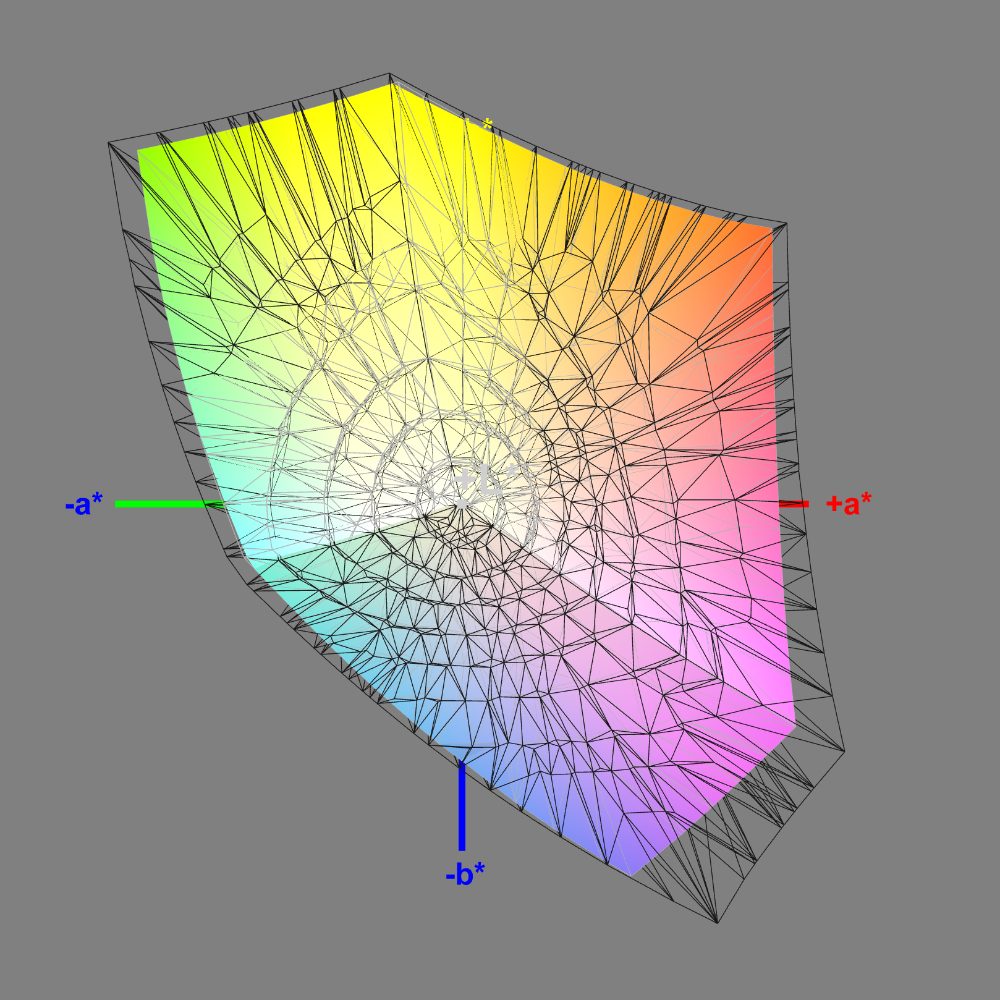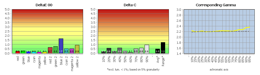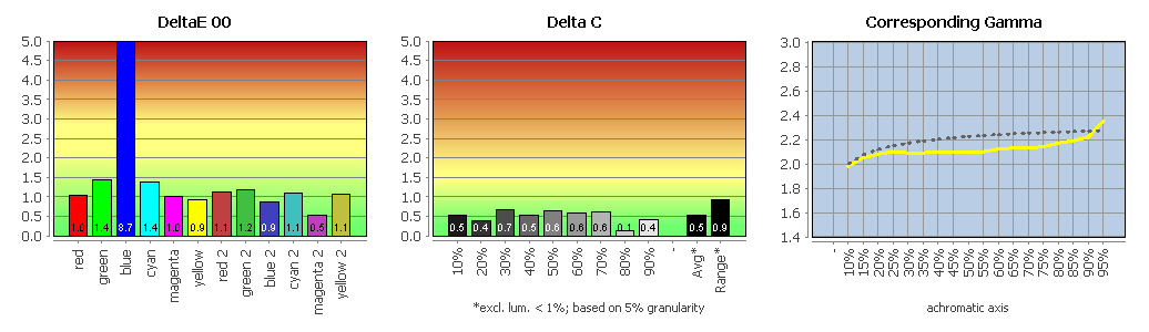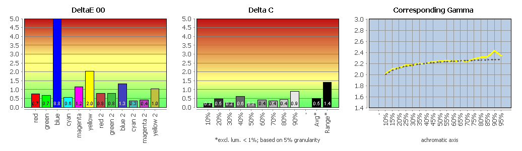 Bei der Graubalance (Delta-C-Average: 0,52; Delta-C-Range: 0,93) sind die Ergebnisse sehr gut. Die Farbwerte (Delta-E-2000-Average: 1,64) erzielen ein gutes Resultat und liegen wie versprochen im Schnitt unter 2 Delta E. Die Maximalabweichung beläuft sich allerdings auf hohe 8,71 Delta E 2000 (RGB: 0 0 255), was in der Grafik bei Blau auch klar auszumachen ist. Der Gammaverlauf beträgt im Schnitt 2,12 und verläuft nicht normgerecht.