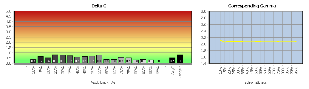 Die Graubalance (Delta-C-Average: 0,53) ist messtechnisch bereits ab Werk sehr gut. Die Delta-C-Range erzielt mit 0,82 ebenfalls einen sehr guten Wert. Das Ergebnis kann sich wirklich sehen lassen und ist für einen Business-Monitor schon außergewöhnlich gut. Die Farbtemperatur ist mit 6369 K zwar etwas wärmer als die Vorgabe von 6500 K, was aber verschmerzbar ist. Das Gamma (Durchschnitt: 2,08) verfehlt allerdings den angestrebten Wert von 2,2 etwas.