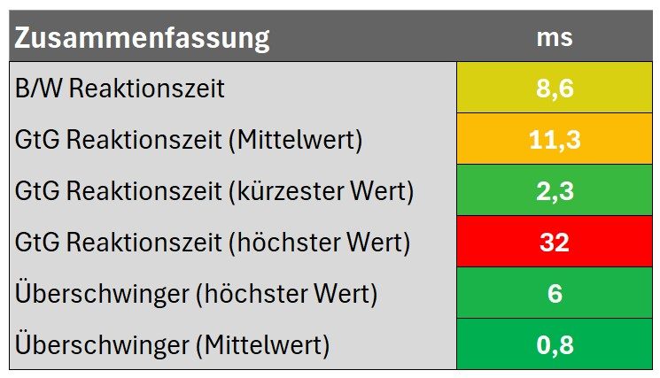 In der Overdrive-Stufe „Mittel“ messen wir den Schwarz-Weiß-Wechsel (0–255) mit 8,6 ms und den schnellsten Grauwechsel mit 2,3 ms. Der Mittelwert über alle Messpunkte liegt bei 11,3 ms. Die Messwerte verbessern sich merkbar.