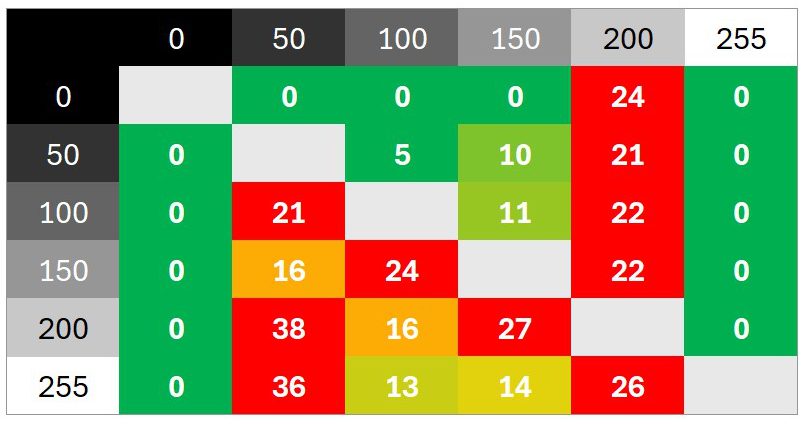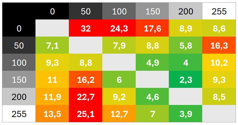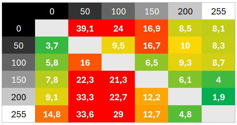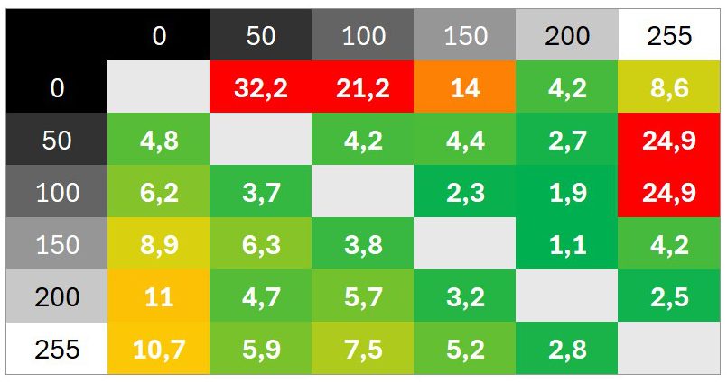 Überschwinger sind keine zu beobachten, die Abstimmung ist sehr neutral. Das Schaltzeiten-Diagramm zeigt unter anderem, wie sich verschiedene Helligkeitssprünge addieren und wie schnell der Monitor in der Werkseinstellung im besten Fall reagiert.