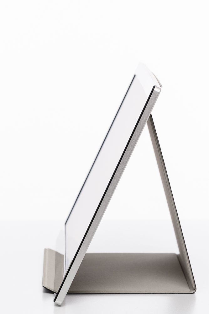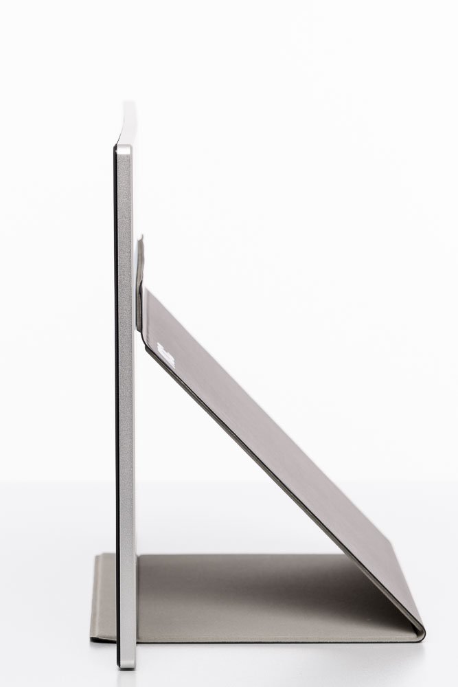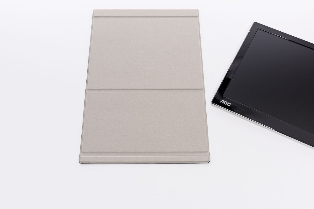 Das Smart-Cover dient sowohl zum Schutz des Displays beim Transport als auch zum Aufstellen. An den beiden Enden sind Magnete integriert. Im Gegensatz zu anderen Lösungen ist die Variante von AOC angenehm selbsterklärend und zugleich sehr flexibel, weil der Neigungswinkel stufenlos von +5° bis +25° verstellt werden kann.