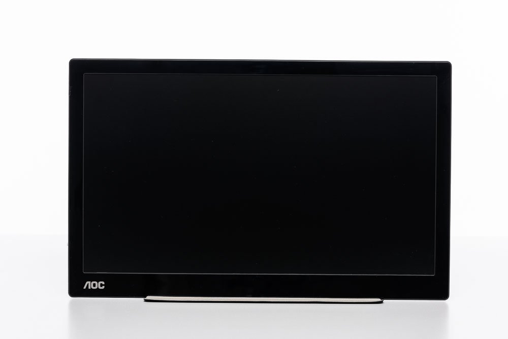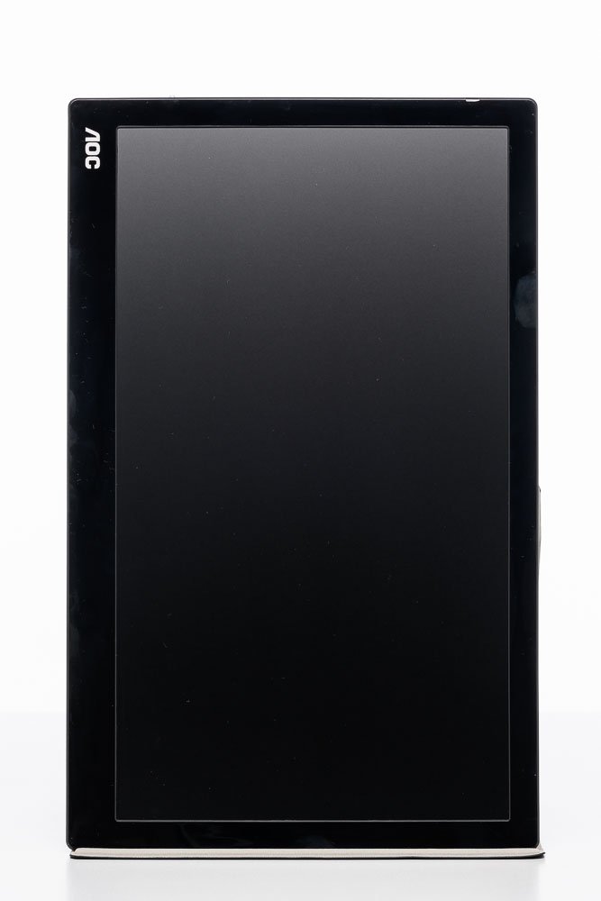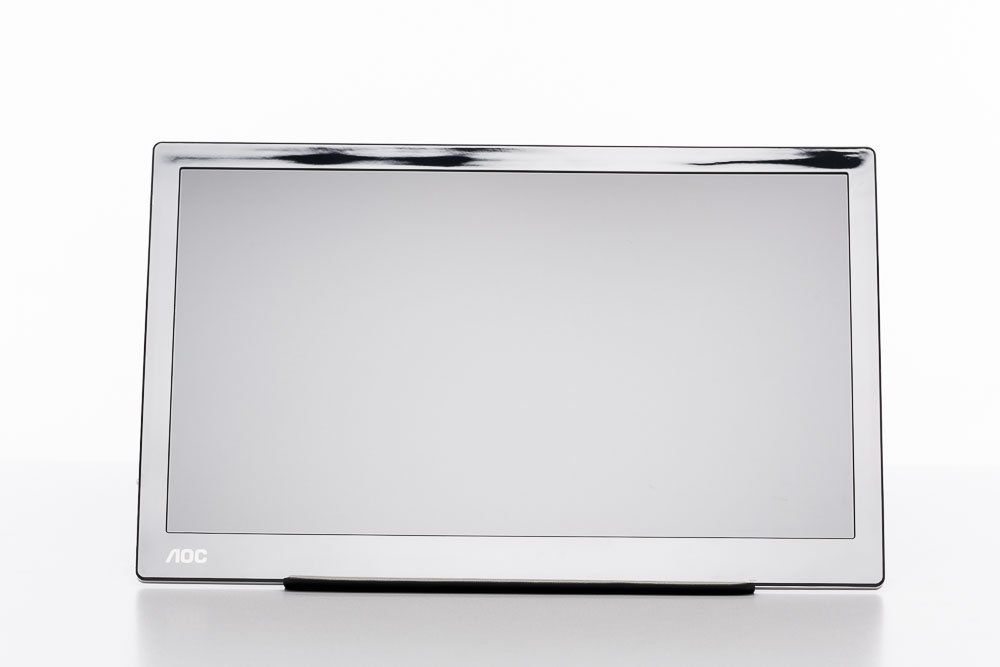 In dem Zusammenhang ist es genauso unverständlich, warum sich AOC beim Rahmen vorn für schwarze, hochglänzende Klavierlack-Optik entschieden hat. Da man so ein Display sehr häufig in die Hand nimmt, sieht es durch die Fingerabdrücke permanent schmuddelig aus. Ferner soll es ja gerade beim mobilen Einsatz unter suboptimalen Beleuchtungsbedingungen überzeugen, und da stört die starke Spiegelung des Rahmens doch gehörig.