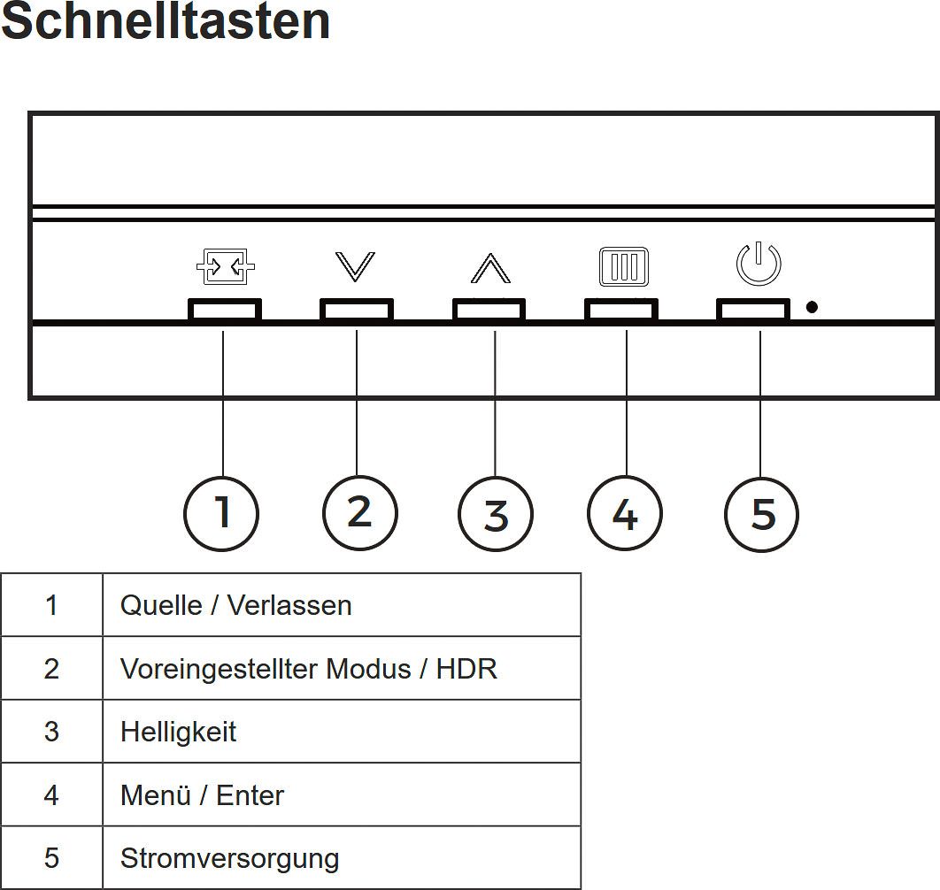 Weniger gelungen ist die Beschriftung der Bedientasten: Selbst bei mittleren Lichtverhältnissen ist sie nur schwer erkennbar. Da sich die Power-Taste zudem weder durch einen größeren Abstand noch durch eine andere Bauform von den übrigen Tasten abhebt, wird der Monitor bei der Bedienung des OSDs nicht selten versehentlich ausgeschaltet. Eine deutlichere Trennung – etwa durch das Platzieren der Status-LED zwischen Bedien- und Power-Taste – hätte hier die Bediensicherheit spürbar verbessert.