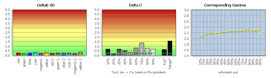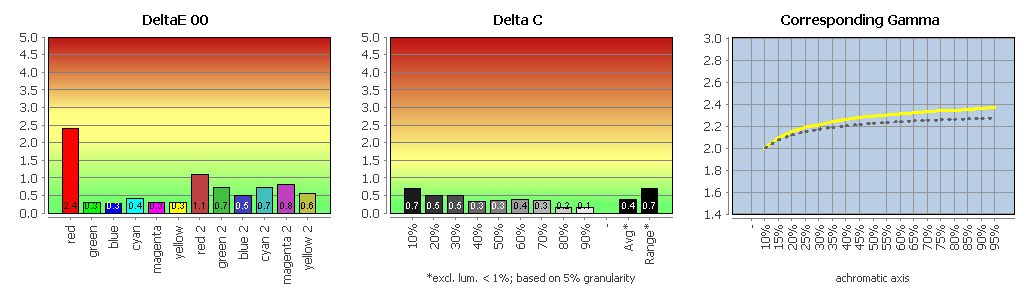 Entsprechend positiv fallen auch die Messergebnisse zur Graubalance aus, die durchweg sehr gute Werte liefern. Gleiches gilt für die Farbabweichungen: Mit einem durchschnittlichen Delta E 2000 von lediglich 0,71 bewegt sich der Monitor hier auf einem Niveau, das man sonst eher von ausgewiesenen Grafikmonitoren kennt. Selbst die in den Messgrafiken sichtbare Maximalabweichung bei Rot bleibt mit einem Delta E 2000 von 2,41 noch im guten Bereich.
