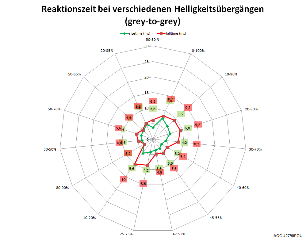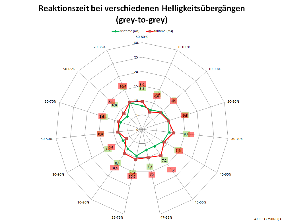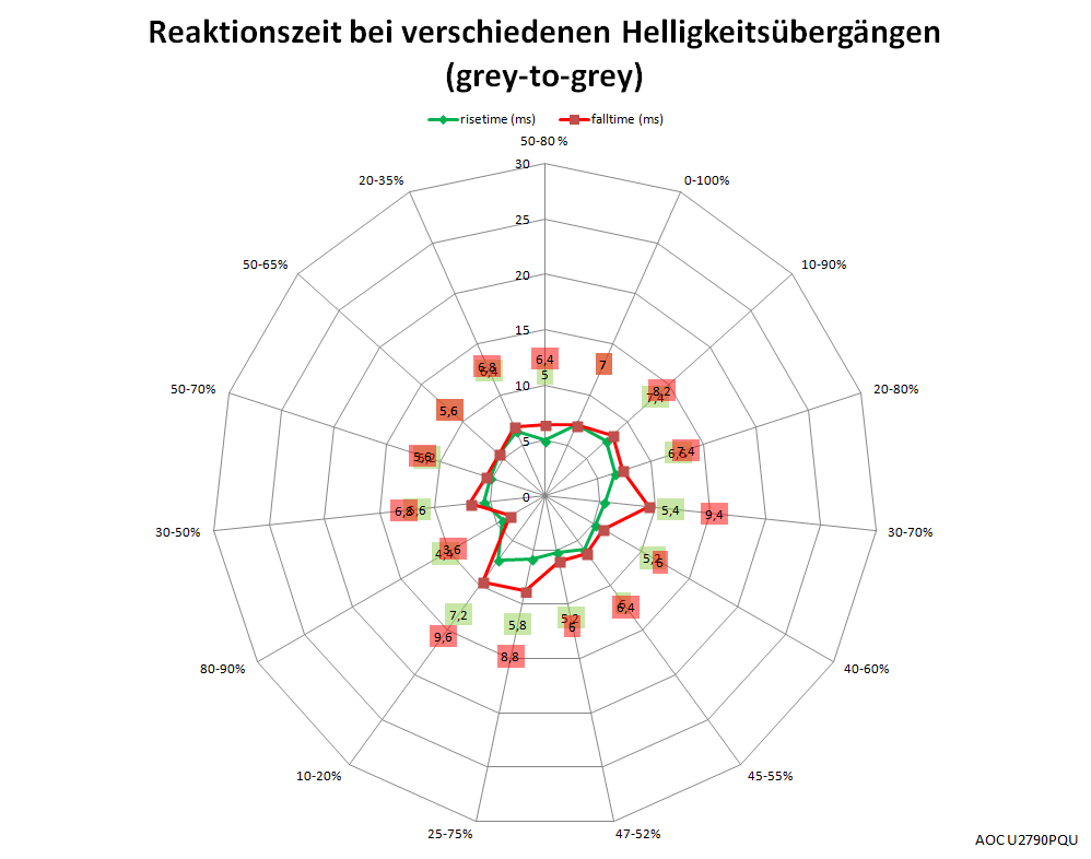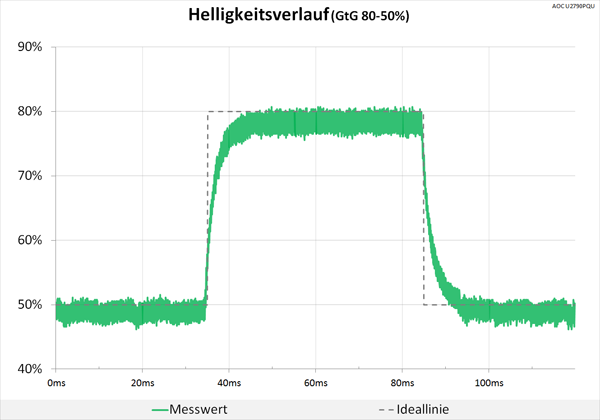 In der Werkseinstellung ist die Pixelbeschleunigung deaktiviert. In diesem Zustand vollzieht der AOC U2790PQU den schnellsten Schwarz-Weiß-Wechsel mit 14 ms und den schnellsten Grauwechsel mit 13,2 ms. Der Durchschnittswert für alle unsere 15 Messpunkte beträgt 17,5 ms. Der CtC-Wert ist mit 15,6 ms gar nicht mal so langsam. Der Helligkeitsverlauf (GtG 80–50 %) ist neutral, die entsprechende Helligkeit wird schnell erreicht.