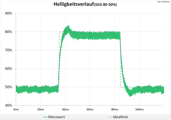 Mit Aktivierung der schnellsten Pixelbeschleunigung verkürzen sich die Schaltzeiten zwar noch ein wenig, der Unterschied fällt aber nicht mehr gravierend aus. Der Schwarz-Weiß-Wechsel beträgt 15,6 ms und ist damit sogar etwas langsamer als mit Übersteuerung auf „Mittel“. Für den schnellsten Grauwechsel benötigt der AOC U2790PQU 6,4 ms. Der Durchschnittswert für alle 15 Messpunkte liegt nun bei 11,1 ms, der CtC-Wert verringert sich auf 6,4 ms. Erkauft werden die schnelleren Schaltzeiten jedoch mit starken Überschwingern im Helligkeitsverlauf, die sich beim Gaming negativ auf die Bildqualität auswirken können.