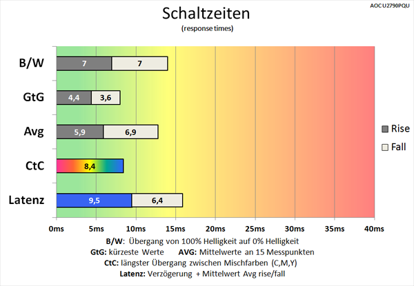 Wir messen beim AOC U2790PQU unabhängig von der eingestellten Pixelbeschleunigung eine Latenzzeit von geringen 9,5 ms. Die halbe mittlere Bildwechselzeit beträgt bei deaktivierter Pixelbeschleunigung (Übersteuerung „Aus“) 8,8 ms. Mit Übersteuerung auf „Mittel“ verkürzt sich der Wert auf 6,4 ms, mit der Einstellung „Stark“ auf 5,6 ms.