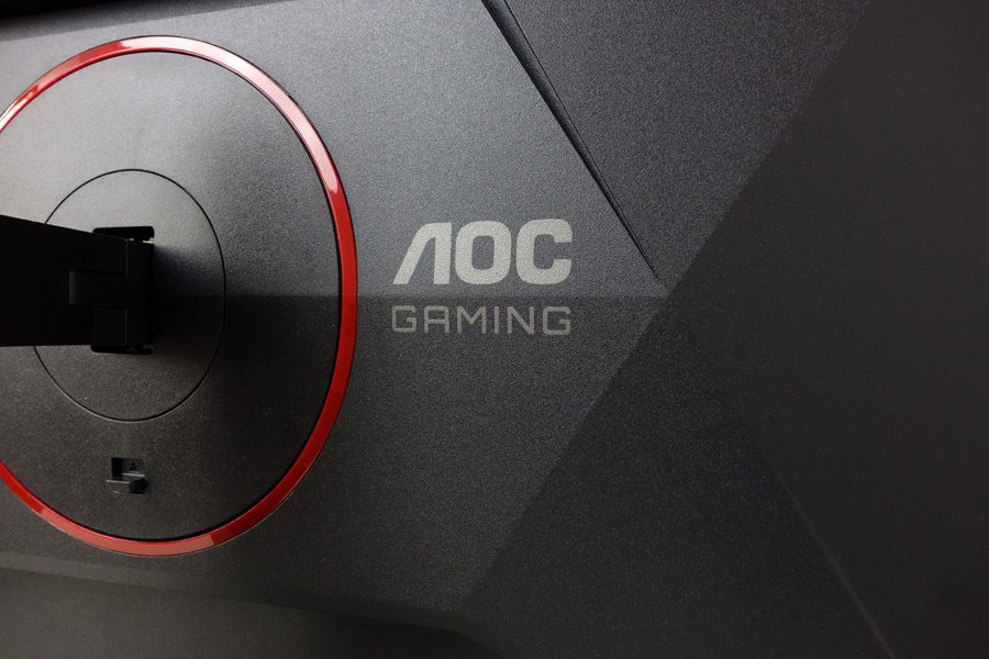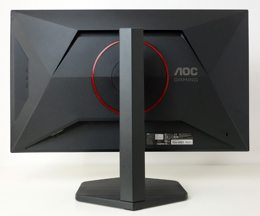 Auf der Gehäuserückseite lassen sich dreieckige Formen erkennen, die dem AOC U27G4R ein sportlich-dynamisches Aussehen verleihen, ohne jedoch übertrieben und Gaming-Monitor-typisch zu wirken. Um die Standfußaufnahme herum zieht sich ein roter Ring, der die ansonsten vollständig schwarze Rückseite mit einem geschickt platzierten Designelement auflockert. Rechts daneben ist die Aufschrift „AOC GAMING“ in heller Schriftfarbe aufgedruckt, ebenso ist dieser Schriftzug auf dem Standfußteller zu finden.