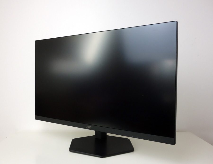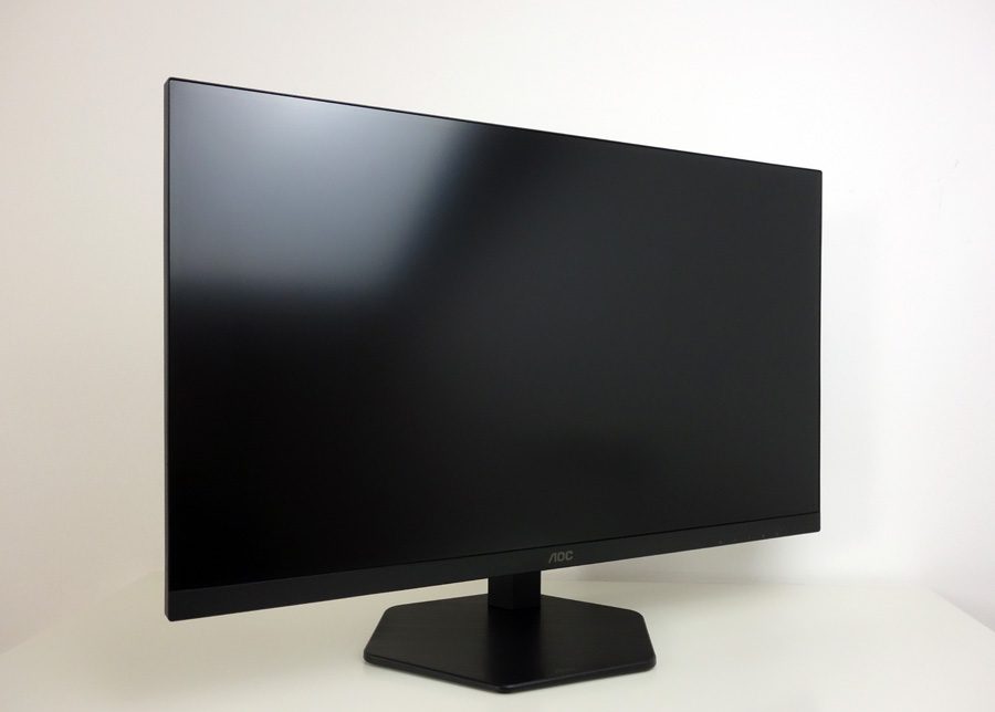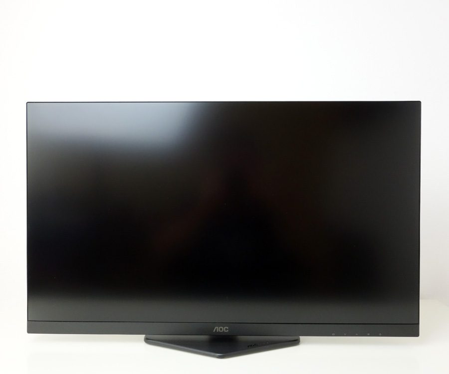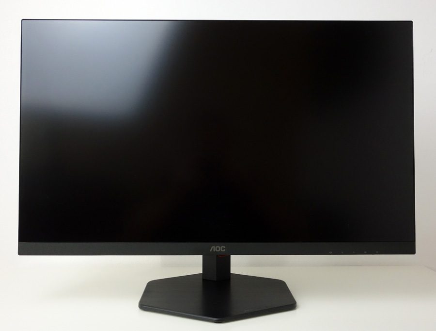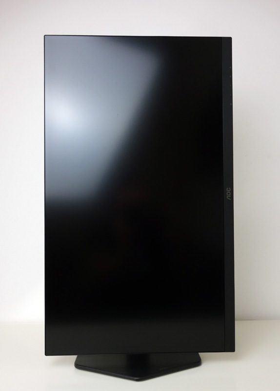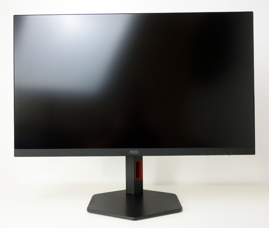 Der AOC U27G4R präsentiert sich mit einem modernen, klar strukturierten Erscheinungsbild. Von vorn wirkt er besonders schlank, da das Panel an drei Seiten nahezu rahmenlos gestaltet ist. Lediglich die untere Kante besitzt einen deutlich größeren Rahmen von etwa 20 mm Höhe, in dessen Mitte das AOC-Logo platziert ist. Das Gehäuse des Monitors besteht vollständig aus schwarz-mattem Kunststoff und ist an den Außenkanten nur etwa 15 mm dick, wird aber zur Mitte hin sichtbar dicker, um der Elektronik im Inneren Platz zu bieten – unter anderem auch dem intern verbauten Netzteil.