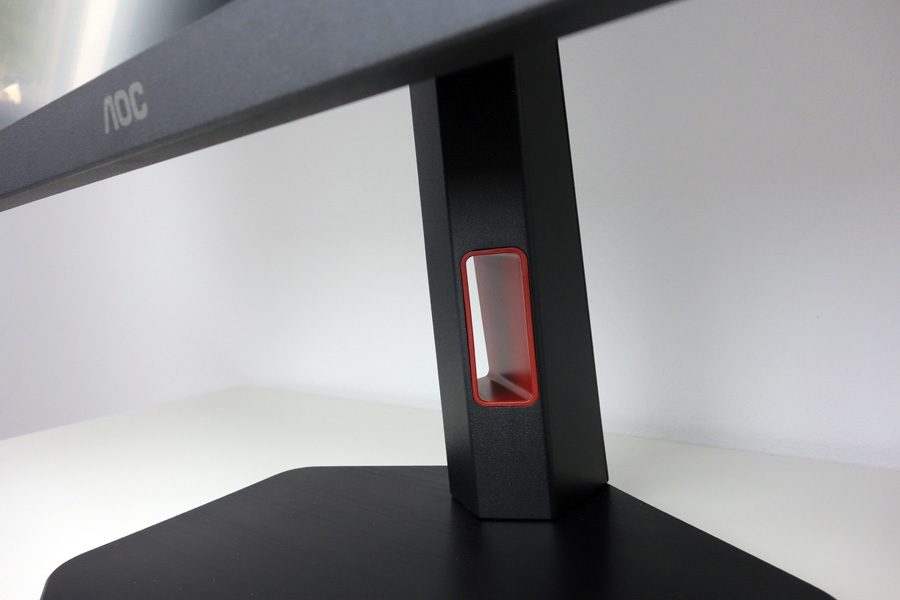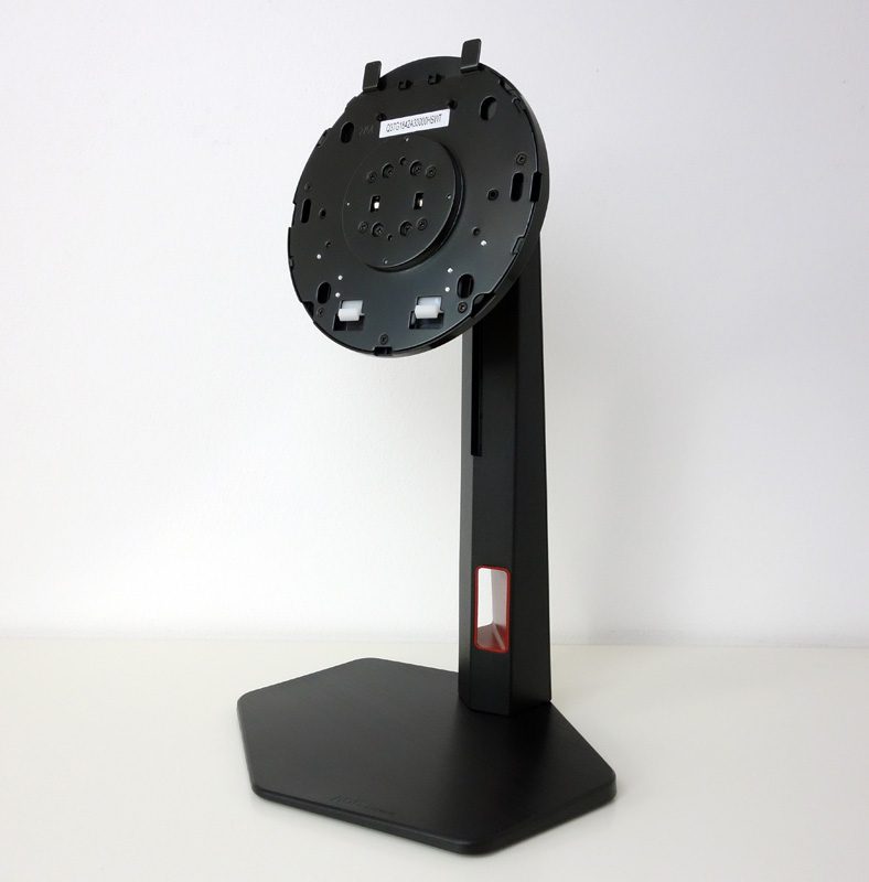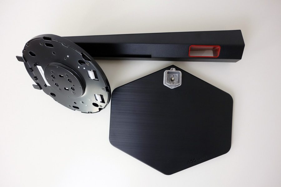 Der Standfuß des AOC U27G4R besteht aus zwei Hauptkomponenten, der Bodenplatte und dem darauf montierten Standarm. Die Bodenplatte hat eine sechseckige Form und besitzt eine fein gebürstete Oberfläche, die dem Fuß, obwohl es nur Kunststoff ist, ein hochwertiges Erscheinungsbild verleiht. Mit einer Flügelschraube wird der Standarm werkzeuglos und stabil mit der Platte verbunden.