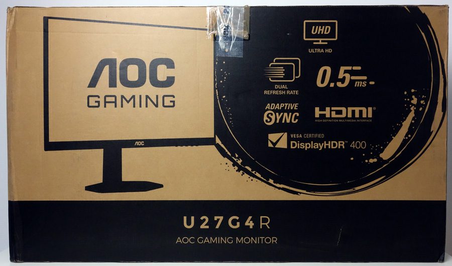 In einem kompakten Karton wird der AOC U27G4R geliefert. Die Außenmaße betragen 81,5 × 48 × 16,5 cm, und das Paket bringt knapp 10 kg auf die Waage. Seitliche Griffausnehmungen machen auch den händischen Transport recht komfortabel. Der Karton ist außen schwarz bedruckt. Neben dem Herstellernamen werden das Modell und noch ein paar Eckdaten genannt.