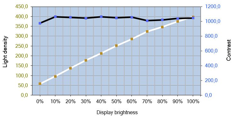 Im Datenblatt des AOC U27G4R lesen wir mit 1000:1 den typischen statischen Kontrastwert, der für IPS-Panels angegeben wird. Nicht immer wird dieser Wert eingehalten. In diesem Fall können wir aber bestätigen, dass die Herstellerangabe korrekt ist. Unsere Messungen ergeben ein durchschnittliches Kontrastverhältnis von 1038:1. Die Werte liegen über den gesamten Helligkeitsbereich recht nahe beieinander, einen Ausrutscher stellt lediglich das Kontrastverhältnis von 976:1 bei 0 % Helligkeit dar. Der Schwarzpunkt bewegt sich dabei von minimal 0,06 cd/m² bei einer Leuchtdichte von 59 cd/m² bis zu maximal 0,38 cd/m² bei der höchsten einstellbaren Helligkeit von 398 cd/m².