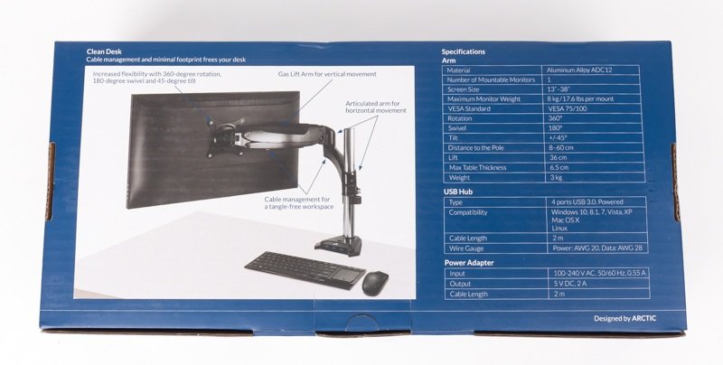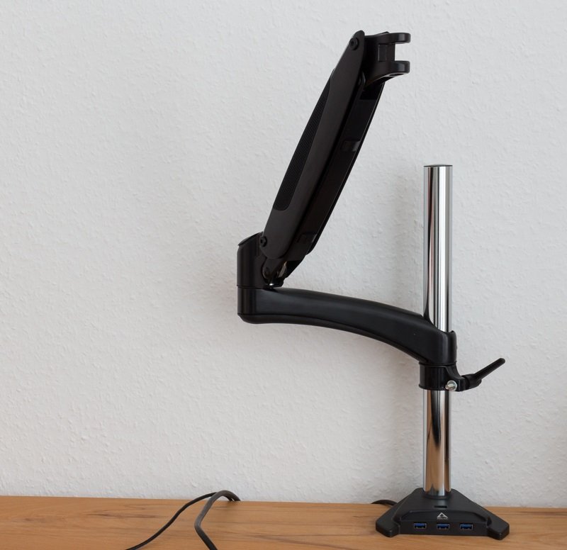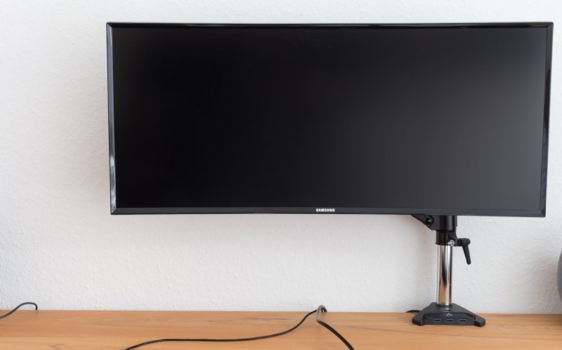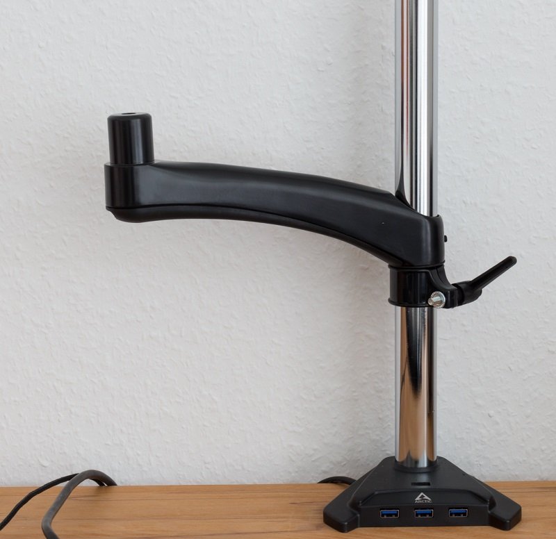 Der USB-3.0-Hub ist zudem ein nettes Zusatz-Feature, das mit einem Netzteil verbunden wird, um die volle Power aller vier Ports gewährleisten zu können. Allen Nutzern mit einem maximal 8 kg schweren und 38 Zoll großen Monitor kann der Monitor-Arm daher empfohlen werden, wenn diese auf der Suche nach einer flexiblen und stabilen Alternative zum Standardstandfuß sind.