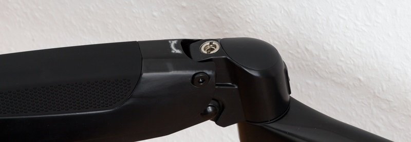 Der Monitor-Arm besteht aus zwei Teilen. Der erste wird auf den Standfuß gesteckt und mit der darunter liegenden Halterung fix an einer Stelle installiert. Der eigentliche Gaslift-Arm ist der zweite Teil. Dieser wird auf den ersten gesteckt und mit einer Schraube befestigt. Die Schraube wird aber nur in ein externes Plastikteil gedreht. Sehr hochwertig wirkt diese Befestigung nicht, aber selbst komplett ohne Befestigung in diesem Bereich dürfte der Monitor stabil gehalten werden.