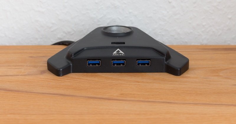 Steht eine stabile Tischplatte zur Verfügung, ist die Montage des Standfußes sehr schnell erledigt. Werkzeuglos wird dieser mit einer großen Schraube unter dem Schreibtisch befestigt. Der USB-3.0-Hub muss anschließend noch mit dem PC verbunden werden. Es steht bei diesem Exemplar zudem ein Netzteil zur Verfügung, was die volle Geschwindigkeit bei allen Ports garantieren soll.