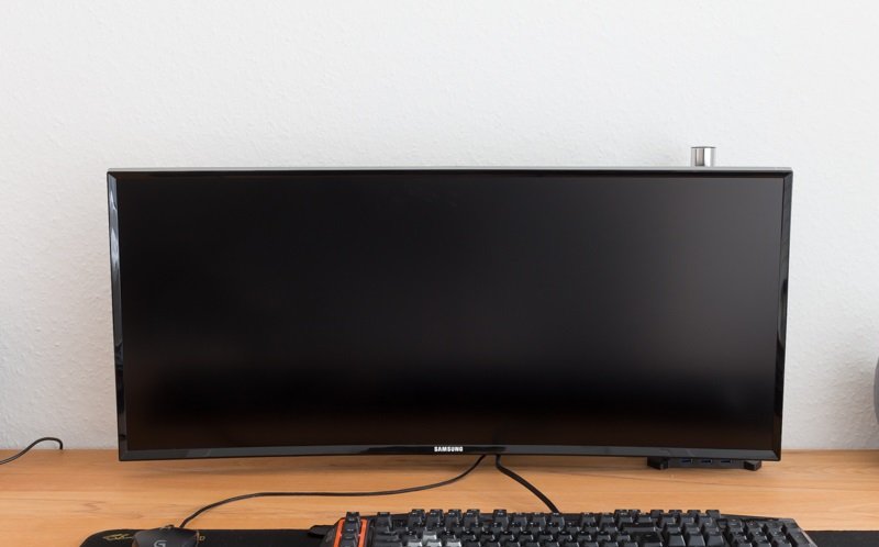 Der Standfuß unseres 34-Zoll-Exemplars wurde bereits demontiert und der Monitor für eine erste Einschätzung vor seinen zukünftigen Verwendungsort gelegt. Ziel soll es sein, den Bildschirm während der Nutzung bequem in der Höhe verstellen zu können, um in jeder Sitzposition einen optimalen Blickwinkel zu erreichen. Das Gerät soll zudem näher an unser Sichtfeld gezogen werden können und nach dem Arbeiten wieder in der Nähe der Wand Platz finden.