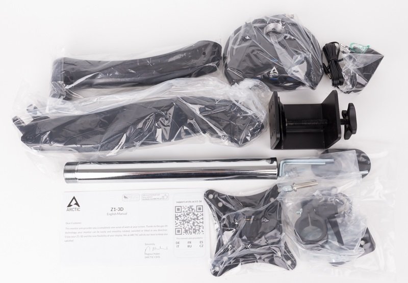 Im Lieferumfang befinden sich der Standfuß mit dem integrierten USB-3.0-Hub, ein Netzteil, das Standbein, der zweiteilige Monitor-Arm, verschiedene Schrauben und eine Anleitung in englischer Sprache. Eine Anleitung auf Deutsch steht auf der Homepage des Herstellers ebenfalls zur Verfügung.