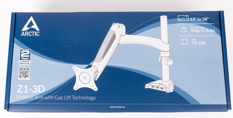Die Verpackung des Arctic Z1-3D misst 411 x 96 x 188 mm (B x H x T) und ist 3,5 kg schwer. Sie ist damit handlich und der Transport einfach.
