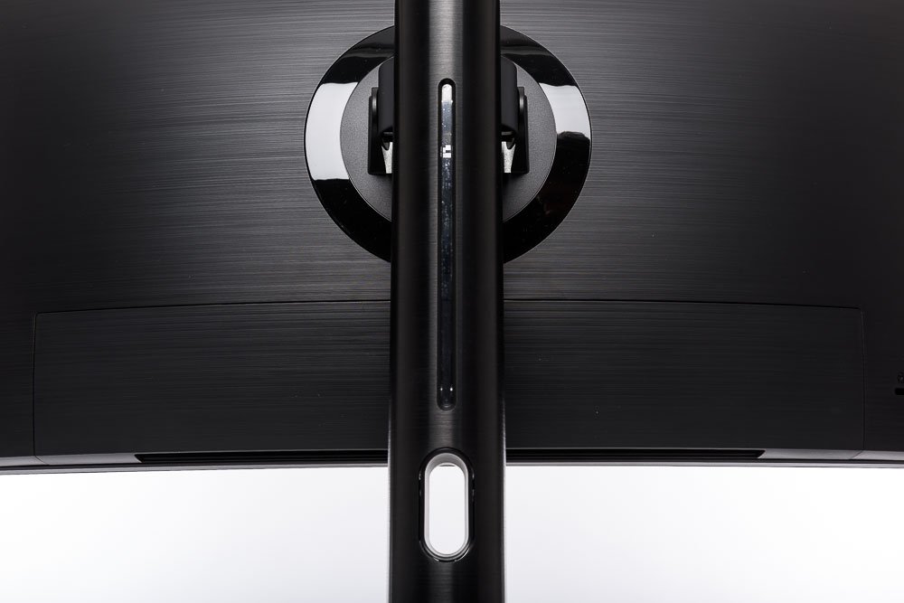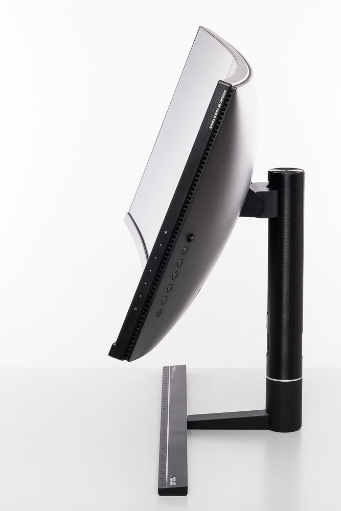 Die Arbeitshöhe in niedrigster Stellung liegt bei ca. 4,5 cm über dem Schreibtisch. Die Höhenverstellung scheint Gasdruck-gefedert zu sein und lässt sich wie die Drehung und Neigung angenehm leicht verstellen. In Verbindung mit der Display-Wölbung ist nach unserer Einschätzung die Arbeitsergonomie sehr gut. Der Wölbungsradius beträgt 1,9 Meter.
